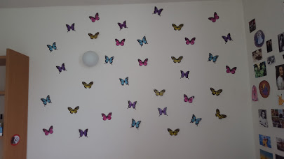 The walls above my bed were different. On a shopping day, I found a collection of wall stickers in the shape of butterflies. The butterflies had a different design and came in pink, purple, blue and yellow. I thought they looked really lovely and I have always had a weakness for butterflies so I decided to use them for decorating my room.