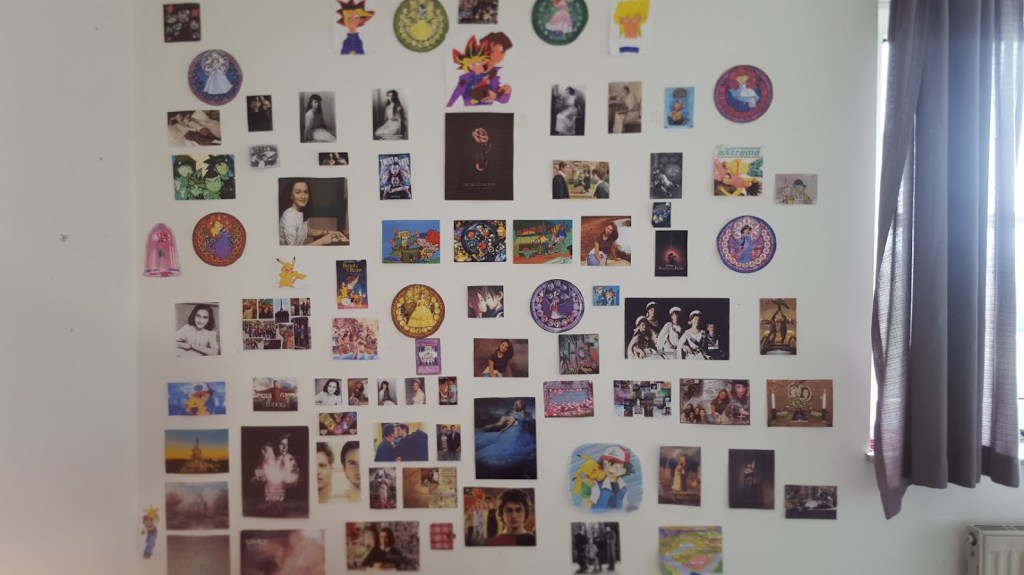 I spent the majority of the day, tacking and sticking pictures onto each wall. Some of the walls had a certain theme; one wall was dedicated to Harry Potter, another had Yu-Gi-Oh pictures everywhere. I wanted to decorate the walls the way that I wanted to. It took a while for the decorating to be finished, but at last, I managed to get my last picture up on the wall.