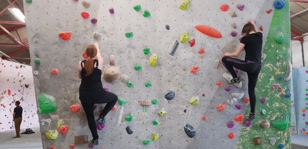 The first day that we travelled to the bouldering centre in Trier, it was pouring rain from the heavens, I remember it very well! We were able to register at the desk, (speaking in very poor German) and were shown the special shoes to wear when climbing up the walls. Once we were ready, the four of us stepped out into the climbing area.